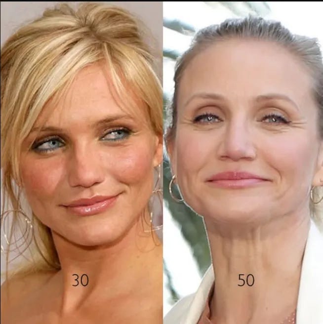 Lighting, angles, make-up, cosmetic interventions, etc can all change how faces look in photos. But the general aging process and patterns I described above have been incredibly consistent in my own observation.