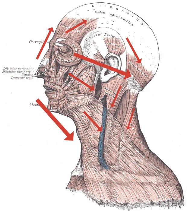 With reference to the facial muscle anatomy picture above, I have drawn arrows to indicate where I feel and observe tension lines form and transmit.