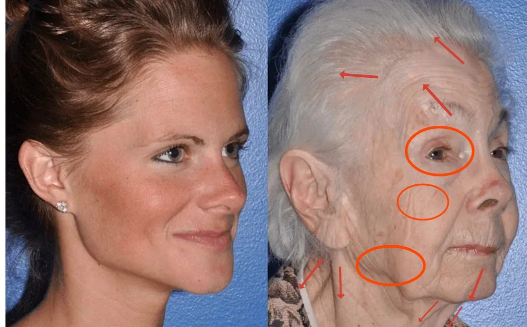 My biochemistry knowledge is insignificant so i’ll just speculate that all these contractive forces the organ-circulatory system is put under gradually impair and degrade the body’s ability to regenerate and repair its face.